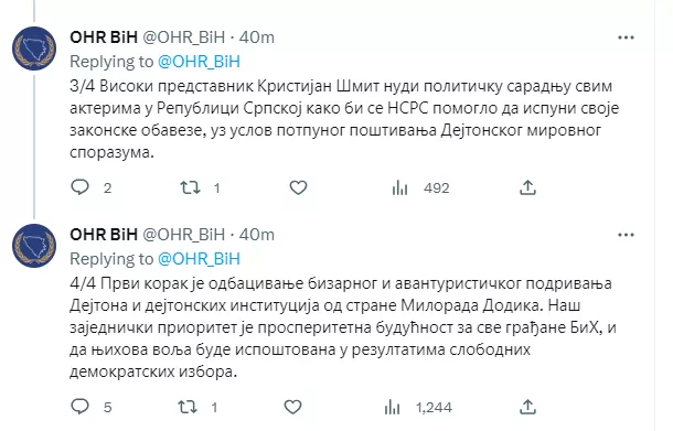 U objavi na Twitteru dodaje se: "Visoki predstavnik Kristijan Šmit (Christian Schmidt) nudi političku saradnju svim akterima u Republici srpskoj kako bi se NSRs pomoglo da ispuni svoje zakonske obaveze, uz uslov potpunog poštivanja Dejtonskog mirovnog sporazuma".