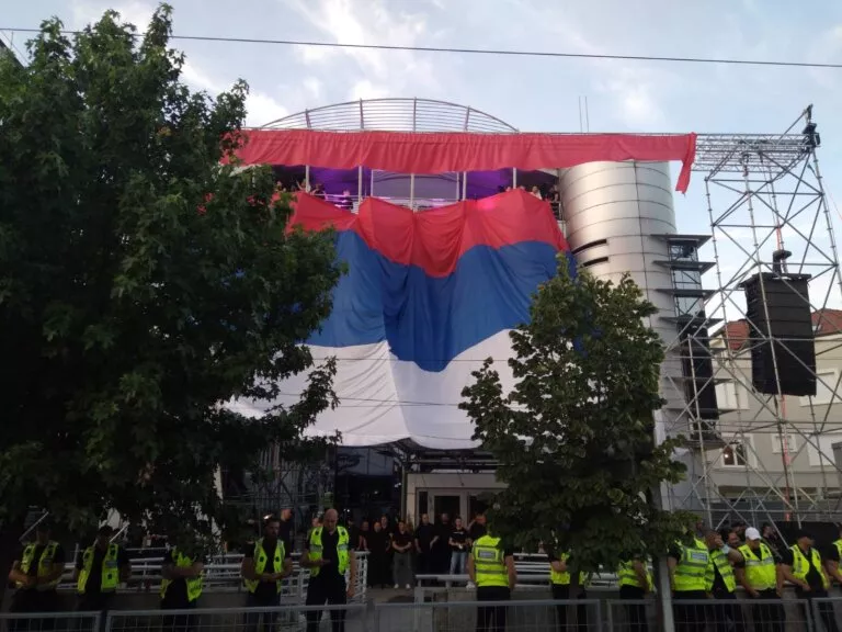 Organizatori puštaju na zastavi Srbije, koju je Pink ranije postavio na svojoj zgradi, projekciju – ko je ubio Olivera (Ivanovića), javlja reporter Danasa.