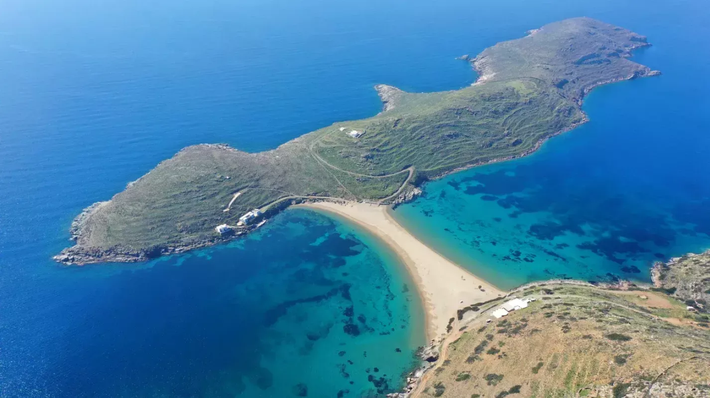 Riječ je zapravo o uskoj pješčanom pojasu dužine oko 240 metara koji spaja Kythnos s malim ostrvom Agios Loukas.