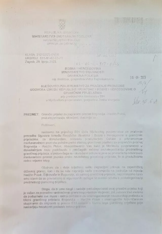 “Obzirom da i dalje bilježimo veliki migracijski pritisak na zajedničkoj državnoj granici, kao i da se ruta migracija sada preusmjerila od mjesta Hadžin Potok, Šiljkovače te Bogovolje, do samog graničnog prijelaza, napominjemo kako smo stava da se privremeno, iz sigurnosnih razloga, ne donosi odluku o prekategorizaciji predmetnog graničnog prijelaza”, navedeno je u dopisu MUP-a Republike Hrvatske dostavljenom direktoru Granične policije BIH Mirku Kuprešakoviću i Zlatku Vranješu, predsjedniku Mješovitog povjerenstva za praćenje provedbe ugovora između Republike Hrvatske i Bosne i Hercegovine o graničnim prijelazima.