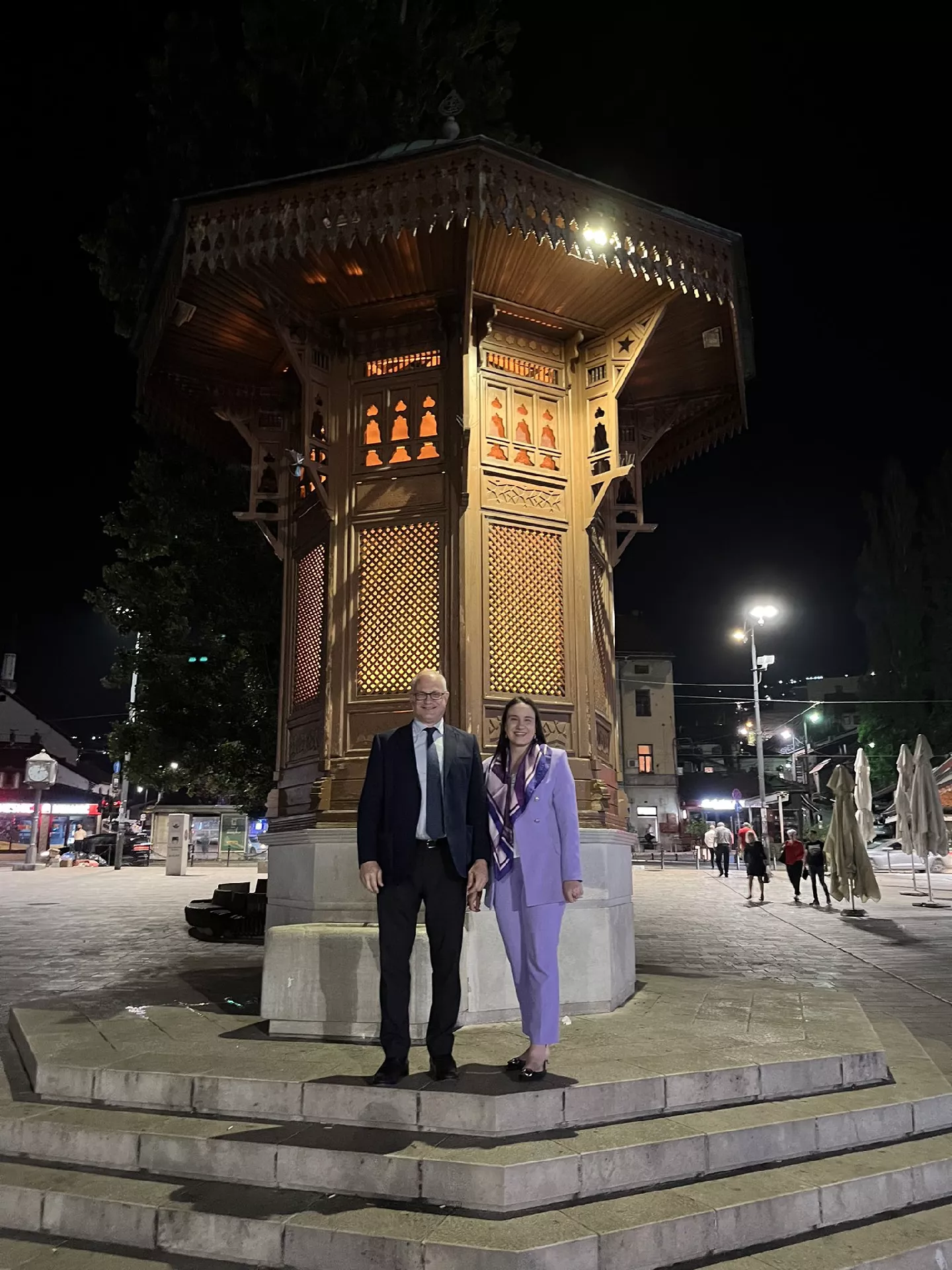 Karić je zatim gosta odvela u noćni obilazak grada. Pa su tako obišli Baščaršiju, sarajevske mostove, prošetali Ferhadijom.