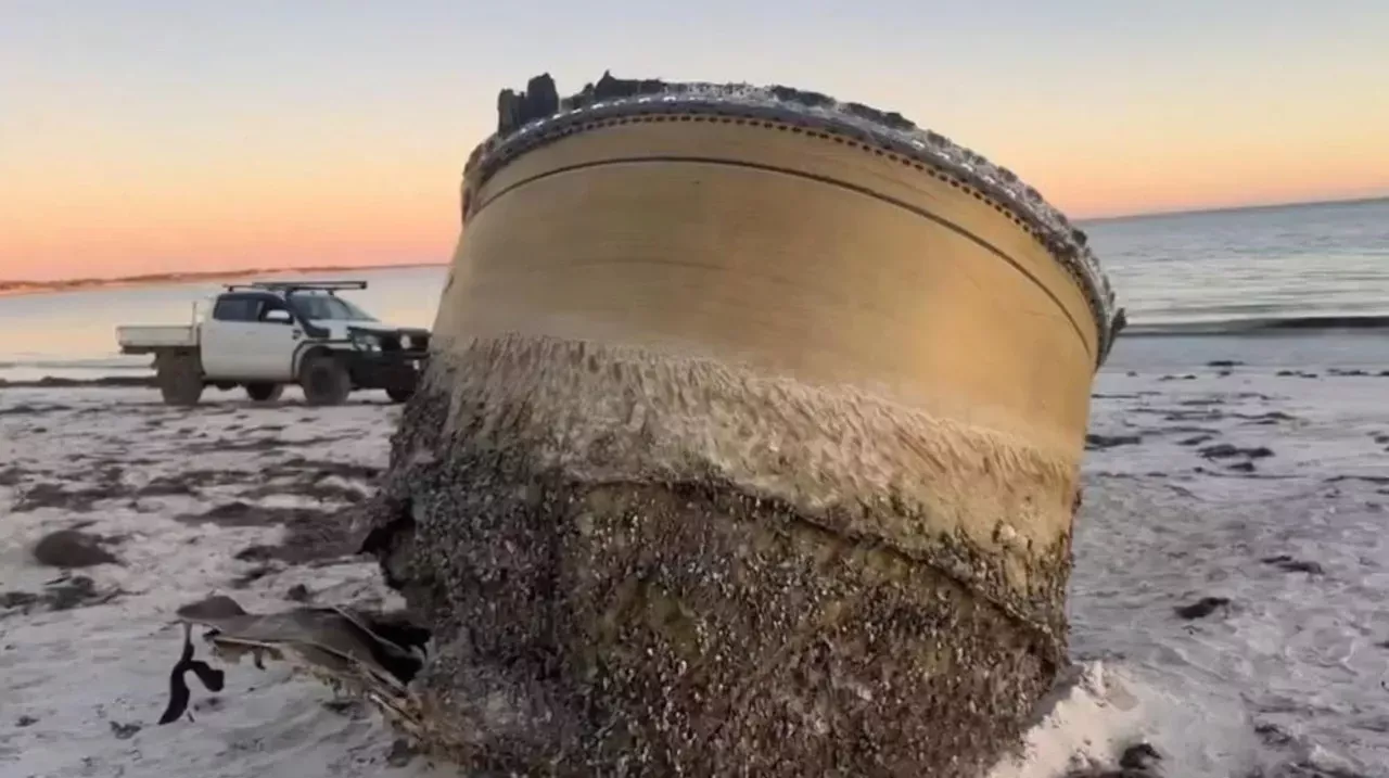 A giant mysterious metal cylinder has left locals stumped after the debris appeared suddenly on the shoreline of WA's Midwest.