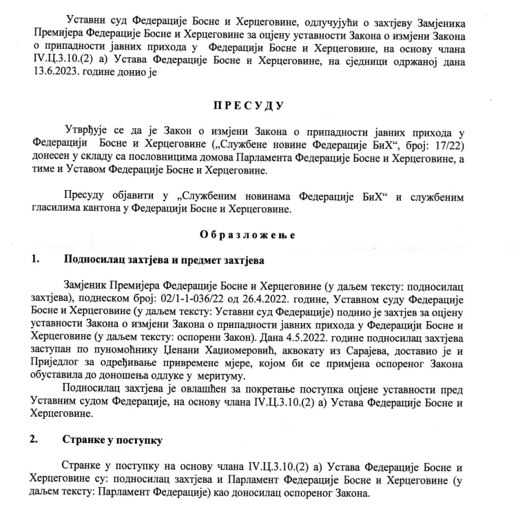 Na osnovu svega izrečenog, odlučeno je kao izreci ove presude čime je prestala potreba za odlučivanjem o privremenoj mjeri", navedeno je u odluci Ustavnog suda FBiH.