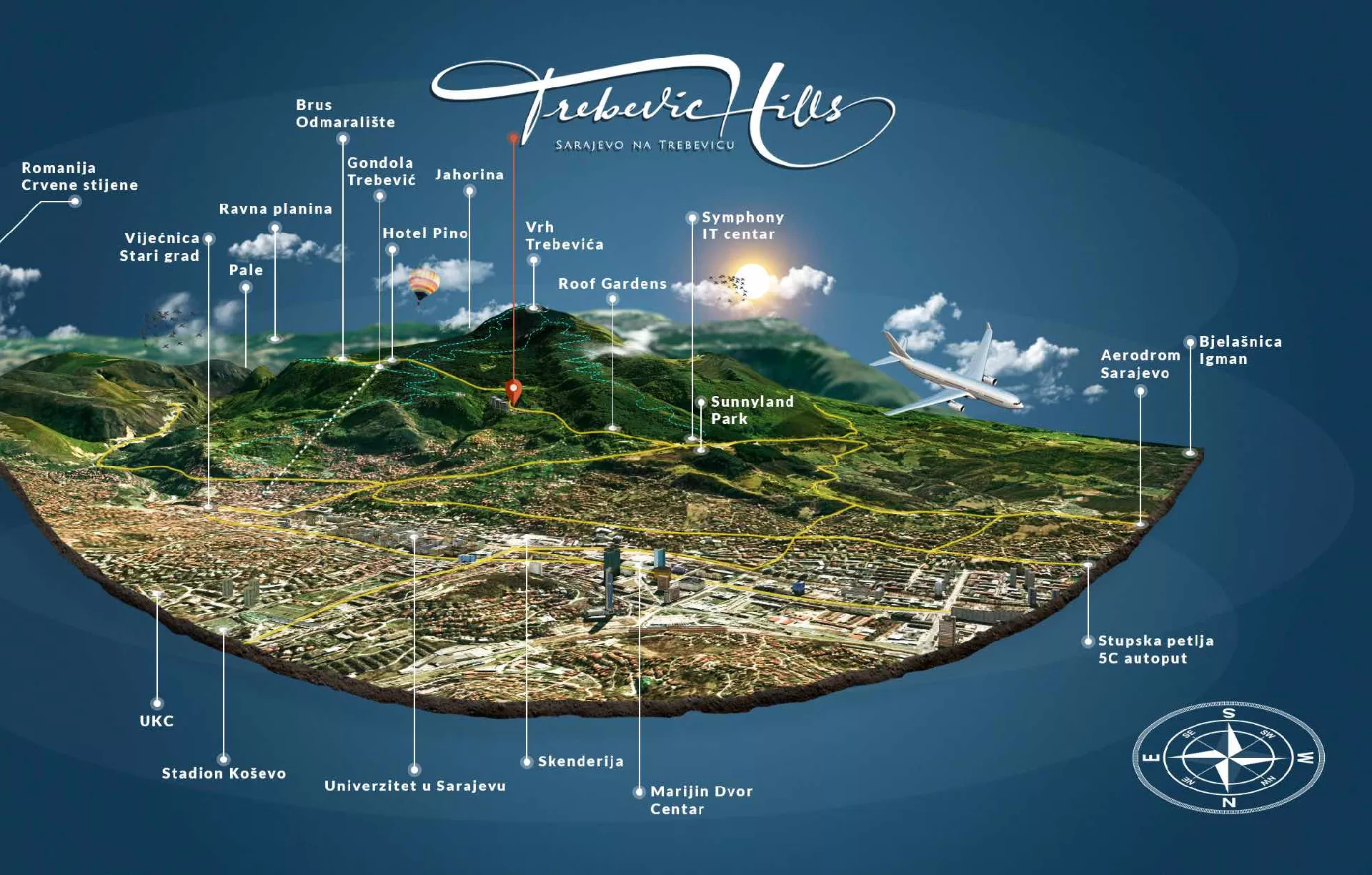 Blizina Bjelašnice i 15 minuta vožnje do Jahorine dodaju ovom projektu dodatnu vrijednost. Trebević Hills također nudi brojne sadržaje koji će zadovoljiti i najzahtjevnije potrebe. Uz 24/7 recepciju, obezbjeđenje i održavanje, bazen sa prelijepim pogledom na Sarajevo, spa-centar, salon ljepote i teretanu, prehrambenu i kozmetičku prodavnicu, apoteku, catering servise, podzemne garaže, luksuzni restorane, caffee lounge, te obdanište s produženim