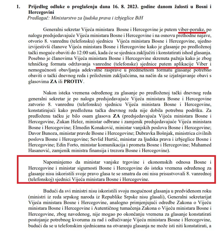 -Posebno je članovima Vijeća ministara Bosne i Hercegovine skrenuta pažnja kako je zbog tehničkog formata održavanja vanredne (telefonske) sjednice putem aplikacije Viber i nemogućnosti obavljanja adekvatne rasprave u predmetnom formatu glasanje potrebno obaviti o tački dnevnog reda i priloženim zaključcima, na način da se izjašnjavanje obavi s glasovima ZA ili PROTIV.