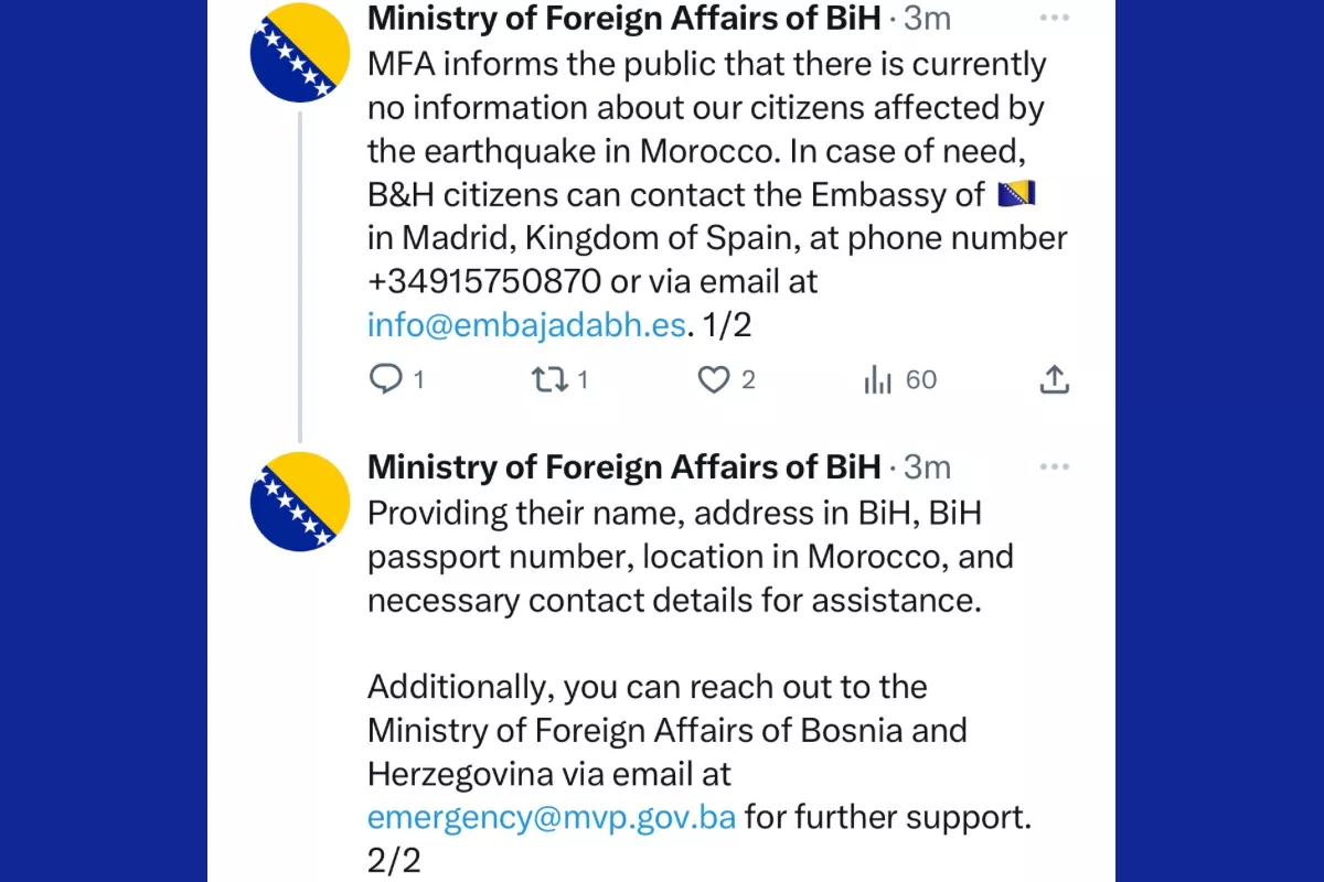 "MVP obavještava javnost da za sada nema podataka o stradalim građanima BiH u potresu u Maroku. U slučaju potrebe, građani BiH mogu se obratiti Veleposlanstvu BiH u Madridu, Kraljevina Španjolska, na broj telefona +34915750870 ili putem e-maila na info@embajadabh.es.