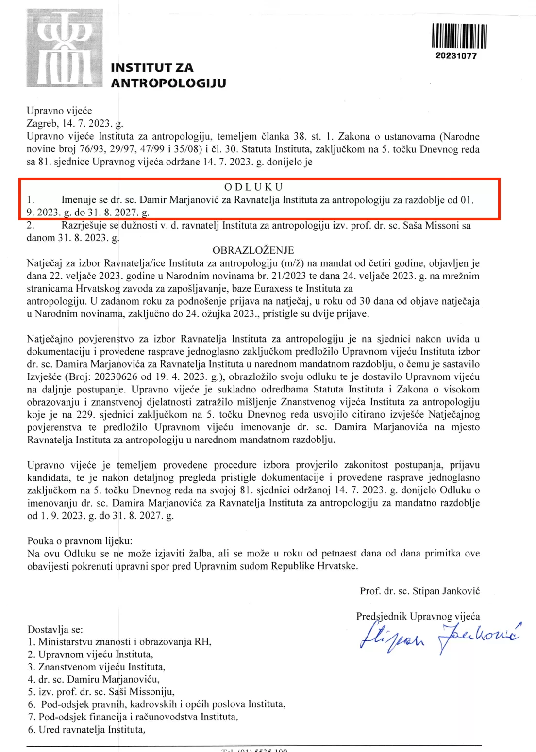"Imenuje se dr. sc. Damir Marjanović za Ravnatelja Instituta za antropologiju za razdoblje od 01.9.2023. g. do 31.8.2027. g. Natječaj za izbor Ravnatelja/ice Instituta na mandat od četiri godine, objavljen je dana 22. veljače 2023. godine u Narodnim novinama", objavljeno je u odluci o imenovanju.