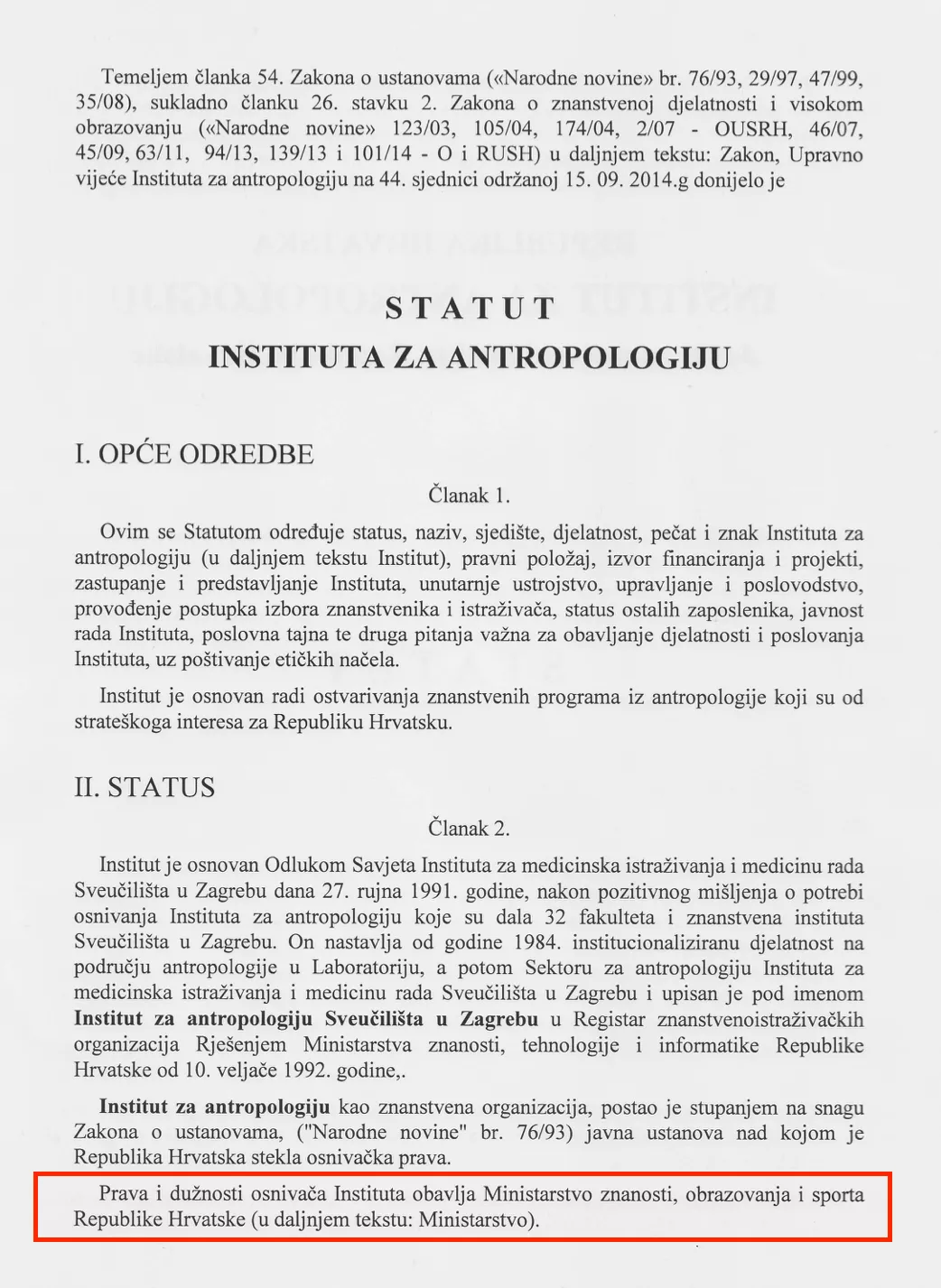 Prema Statutu, Institut za antrolopogiju je javni znanstveni institut Republike Hrvatske, a prava i dužnosti osnivača obavlja Ministarstvo znanosti, obrazovanja i sporta RH.