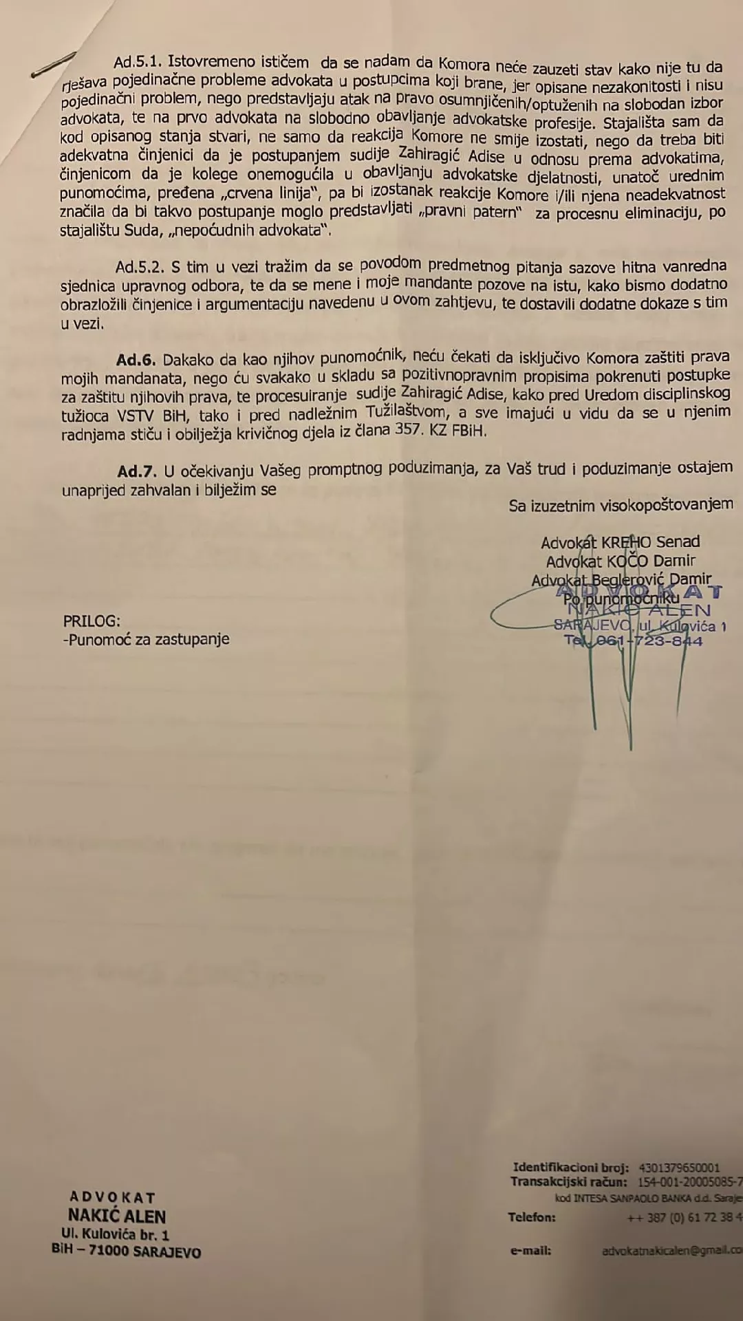 „Dakako da kao njihov punomoćnik, neću čekati da isključivo Komora zaštiti prava mojih mandanata, nego ću svakako u skladu sa pozitivnopravnim propisima pokrenuti postupke za zaštitu njihovih prava, te procesuiranje sudije Zahiragić Adise, kako pred Uredom disciplinskog tužioca VSTV BiH, tako i pred nadležnim Tužilaštvom, a sve imajući u vidu da se u njenim radnjama stiču i obilježja krivičnog djela iz člana 357. KZ FBiH“, istakao je Nakić.