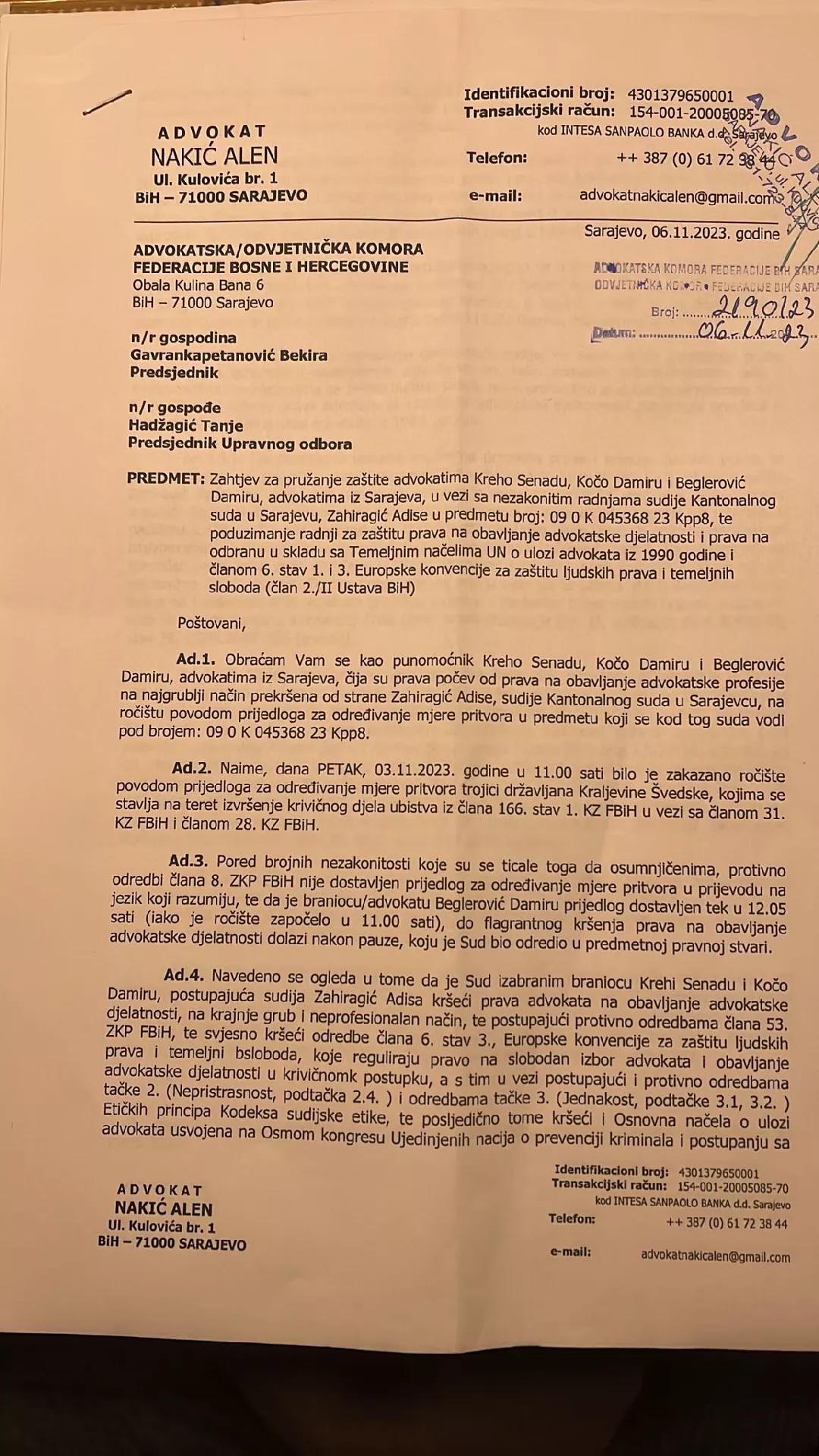 Advokati Senad Kreho, Damir Kočo i Damir Beglerović podnijeli su zahtjev Advokatskoj komori za pružanje zaštite, te poduzimanje radnji za zaštitu prava na obavljanje advokatske djelatnosti i prava na odbranu u skladu sa Temeljnim načelima UN o ulozi advokata iz 1990. godine i Evropske konvencije za zaštitu ljudskih prava i temeljnih sloboda.