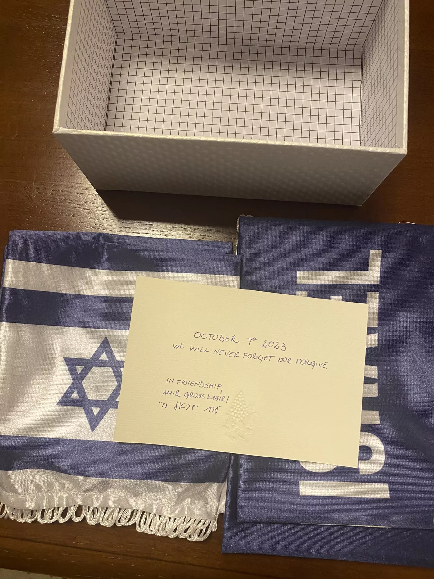 U paketu se nalazi šal Izraela i poruka "7. oktobar 2023. Nikada nećemo zaboraviti niti oprostiti".