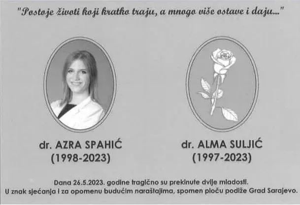 "U sarajevskom naselju Marijin Dvor, 26. maja 2023. došlo je do teške saobraćajne nesreće u kojoj su život izgubile dvije mlade doktorice, dr. Azra Spahić i dr. Alma Suljić.