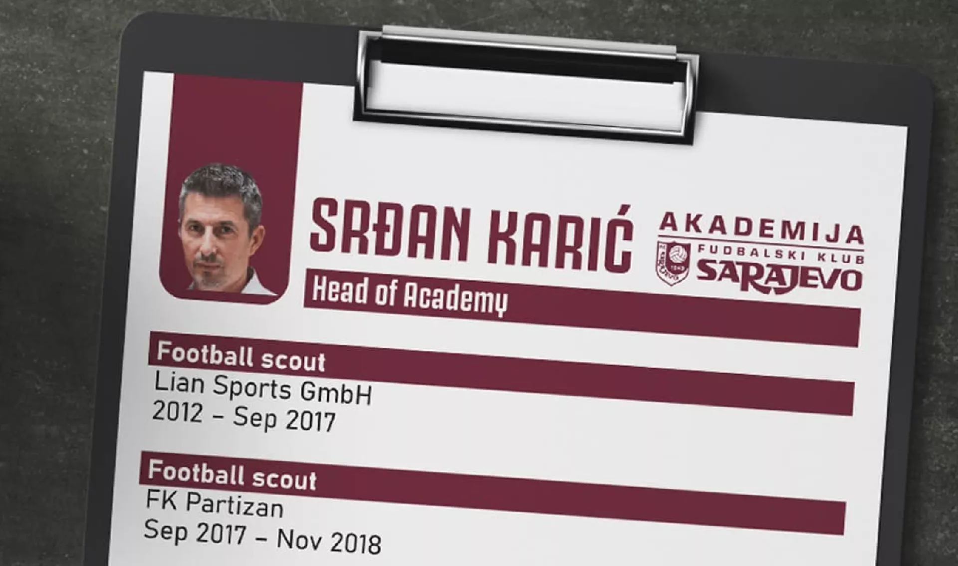 (Patria) - Srđan Karić novi je direktor Akademije Fudbalskog kluba (FK) Sarajevo.