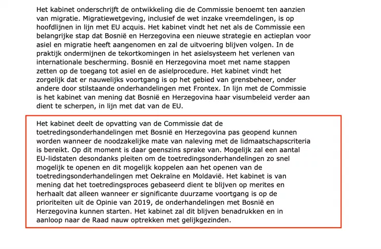 “Vlada smatra da pristupni proces treba ostati temeljen na zaslugama i ponavlja da pregovori s Bosnom i Hercegovinom mogu započeti tek kada dođe do značajnog održivog napretka u pogledu prioriteta navedenih u Mišljenju iz 2019. godine”, navedeno je u dokumentu.