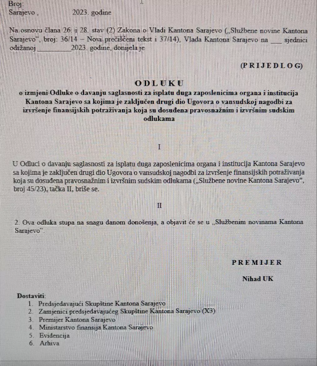 Kao šef Kluba SBiH sam u maju mjesecu ove godine uputio inicijativu prema Vladi KS da poništi nezakoniti javni poziv za zaključenje vansudskih nagodbi za izmirenje finansijskih potraživanja iz radnog odnosa po pravosnažnim i izvršnim sudskim odlukama dosuđenim zaposlenicima u organima i institucijama Kantona Sarajevo, te isplatu izvrši u skladu sa Zakonom o izvršnom postupku FBiH i da omogući provođenje rješenja o izvršenju iz odluke Ustavnog suda BiH AP-3761/20, što je zakonska obaveza Vlade KS.