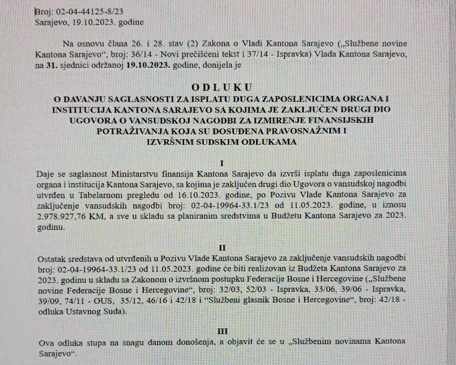 No, našim izlaskom iz koalicije ovaj model je odbačen i Vlada KS se vratila na početne postavke, tj. rad mimo zakona, nudeći vansudske nagodbe i sporazum za sporove koji su izgubljeni u pravnom postupku, što je svojevrsan pravni nonsens koji ne postoji nigdje u svijetskoj pravnoj praksi. Posmatrano iz pravne perspektive, na ovakav „sporazum“ ili bolje rečeno ucjenu vlasti, može pristati samo potpuna budala ili potpuno očajan čovjek u teškoj materijalnoj situaciji. A najprije da Kanton Sarajevo čekaju nove tužbe i gomilanje unutrašnjeg duga po ovoj stavci, koja je mogla biti jednostavno i u okvirima zakona rješena.