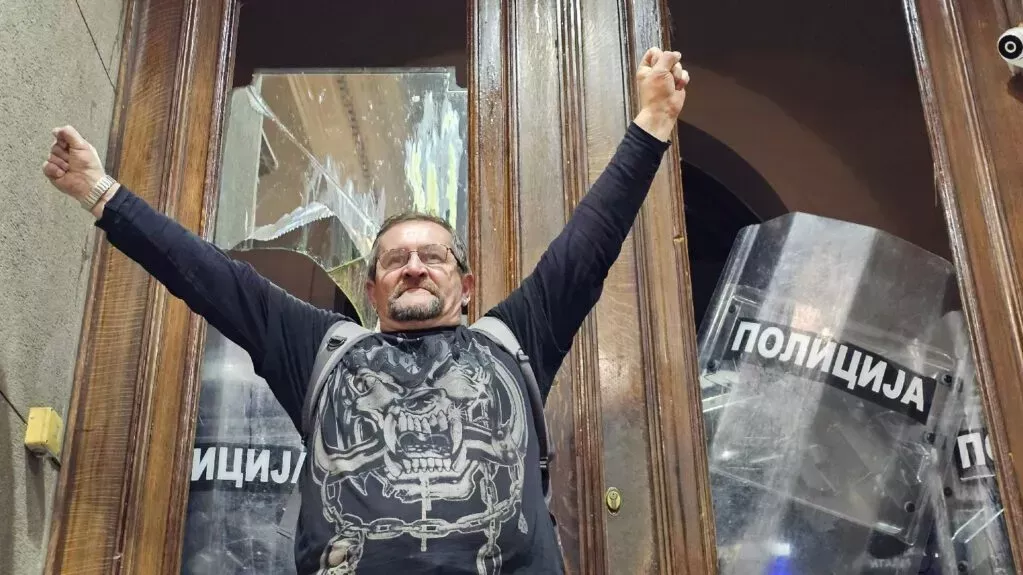 "Izađite napolje neće vam biti ništa. Garantujemo vam punu bezbednost", uzvikivao je Milivojević, dok su okupljeni skandirali.