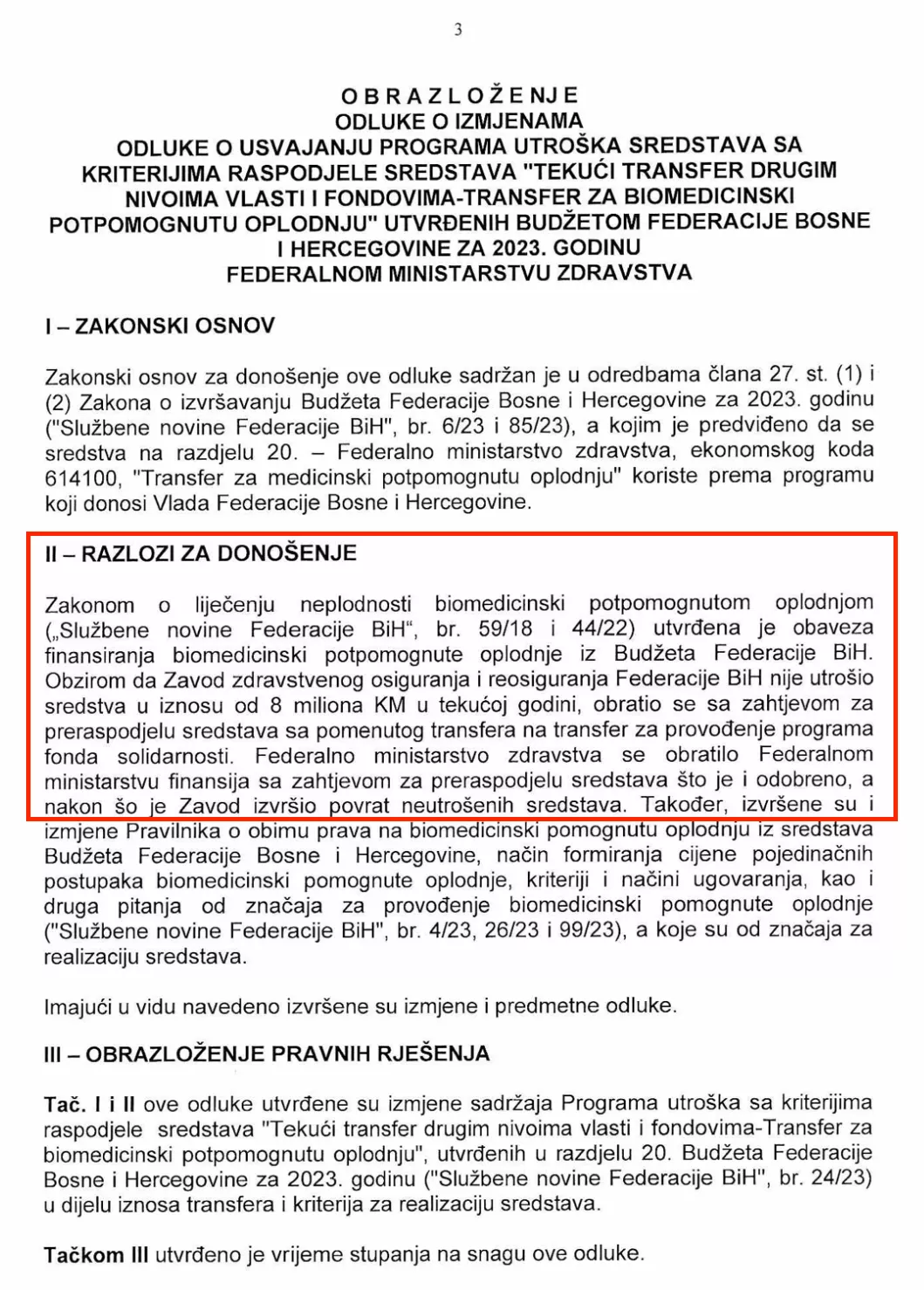 Federalno ministarstvo zdravstva se obratilo Federalnom ministarstvu finansija sa zahtjevom za preraspodjelu sredstava, što je i odobreno, a nakon što je Zavod izvršio povrat neutrošenih sredstava", navedeno je u obrazloženju Odluke Vlade FBiH od 27.12.2023. godine.