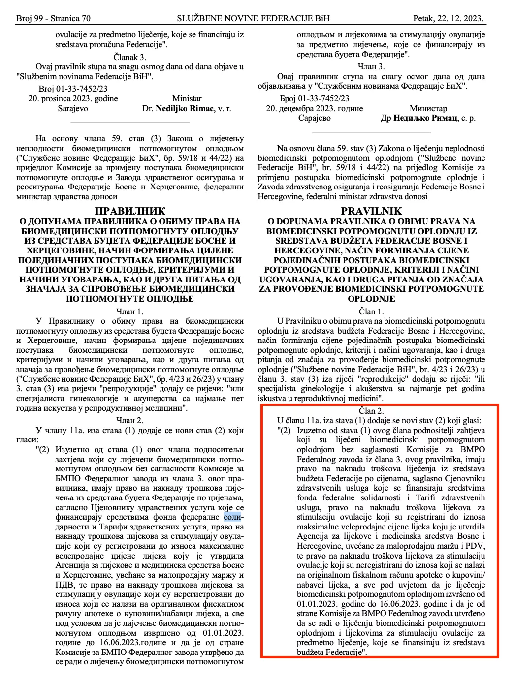 "U članu 11a. iza stava (1) dodaje se novi stav (2) koji glasi: '(2) Izuzetno od stava (1) ovog člana podnositelji zahtjeva koji su liječeni biomedicinski potpomognutom oplodnjom bez saglasnosti Komisije za BMPO Federalnog zavoda iz člana 3. ovog pravilnika, imaju pravo na naknadu troškova liječenja iz sredstava budžeta Federacije po cijenama, saglasno Cjenovniku zdravstvenih usluga koje se finansiraju sredstvima Fonda federalne solidarnosti i Tarifi zdravstvenih usluga, pravo na naknadu troškova lijekova za stimulaciju ovulacije koji su registrirani do iznosa maksimalne veleprodajne cijene lijeka koju je utvrdila Agencija za lijekove i medicinska sredstva Bosne i Hercegovine, uvećane za maloprodajnu maržu i PDV, te pravo na naknadu troškova lijekova za stimulaciju ovulacije koji su neregistrirani do iznosa koji se nalazi na originalnom fiskalnom računu apoteke o kupovini/nabavci lijeka, a sve pod uvjetom da je liječenje biomedicinski potpomognutom oplodnjom izvršeno od 01.01.2023. godine do 16.06.2023. godine i da je od strane Komisije za BMPO Federalnog zavoda utvrđeno da se radi o liječenju biomedicinski potpomognutom oplodnjom i lijekovima za stimulaciju ovulacije za predmetno liječenje, koje se finansiraju iz sredstava budžeta Federacije".