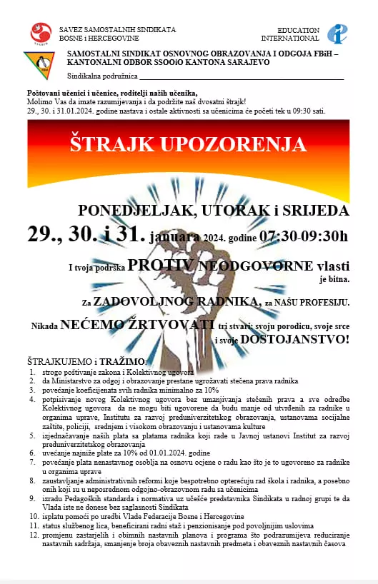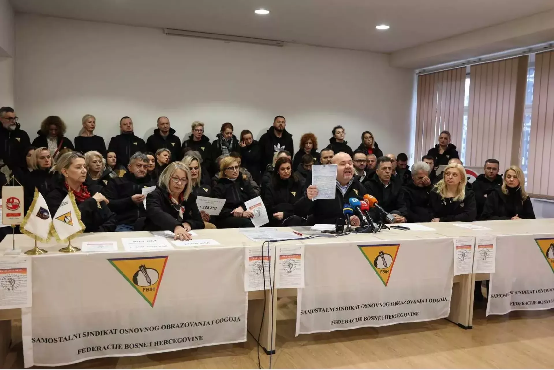 Samostalni sindikat osnovnog obrazovanja i odgoja Federacije Bosne i Hercegovine - Kantonalni odbor sindikata u Kantonu Sarajevo na današnjoj press konferenciji iznio je svoje zahtjeve, te između ostalog traže poštivanje zakona i kolektivnog ugovora, uvećanje najniže plate za 10 posto od 1. januara ove godine, povećanje plata nenastavnog osoblja, izjednačavanje plata sa platama radnika koji rade u Javnoj ustanovi Institut za razvoj preduniverzitetskog obrazovanja, promjenu zastarjelih i preobimnih nastavnih planova i programa.