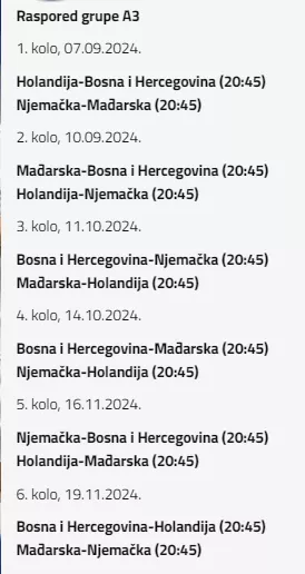 Zmajevi će prvo 16. novembra gostovati Njemačkoj (20.45 sati), a u posljednjem kolu koje se igra 19. novembra bh. ekipu čeka duel na domaćem terenu protiv Nizozemske (20.45 sati).