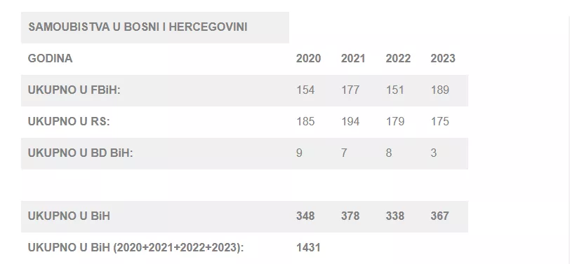 (Patria) - Na osnovu podataka, prikupljenih kroz analizu statističkih biltena Federalnog zavoda za statistiku i Zavoda za statistiku Rs, službenih podataka Policije Brčko distrikta BiH i medija, ustanovljeno je da je u BiH u periodu od 2020. do 2023. godine samoubistvo počinila 1.431 osoba.