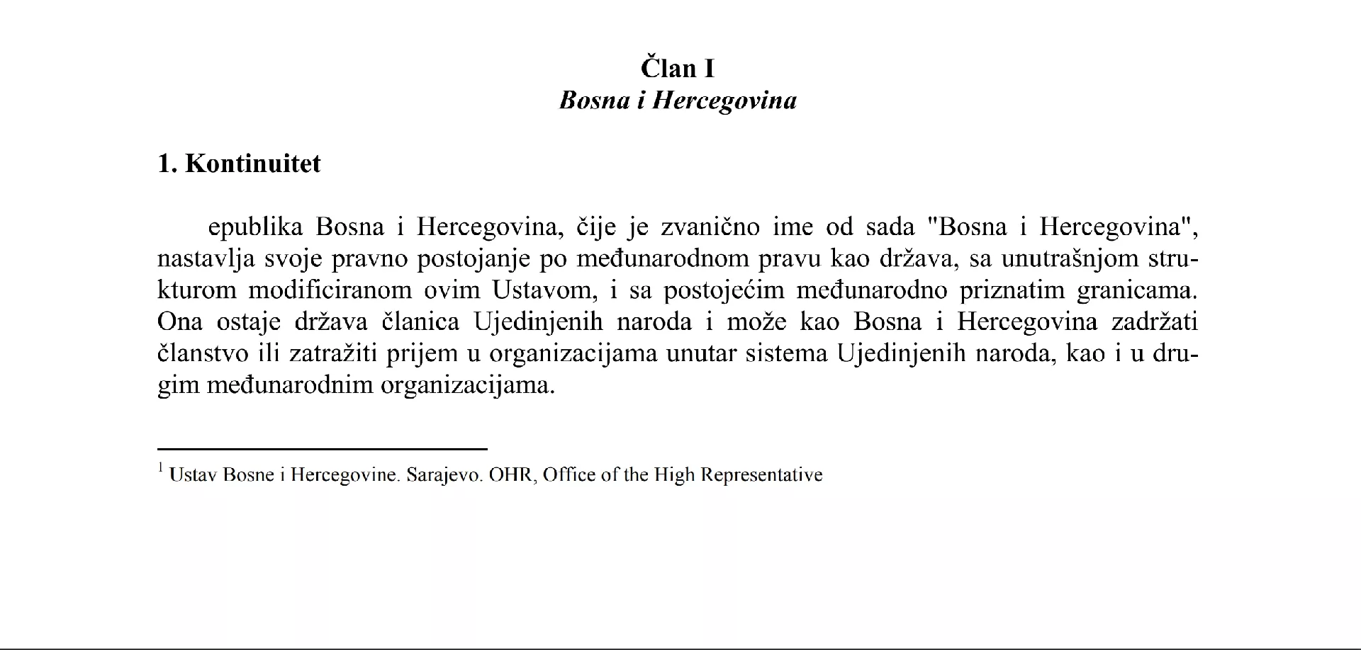 "Republika Bosna i Hercegovina, čije je zvanično ime od sada 'Bosna i Hercegovina', nastavlja svoje pravno postojanje po međunarodnom pravu kao država, s unutrašnjom strukturom modificiranom ovim Ustavom, i s postojećim međunarodno priznatim granicama.