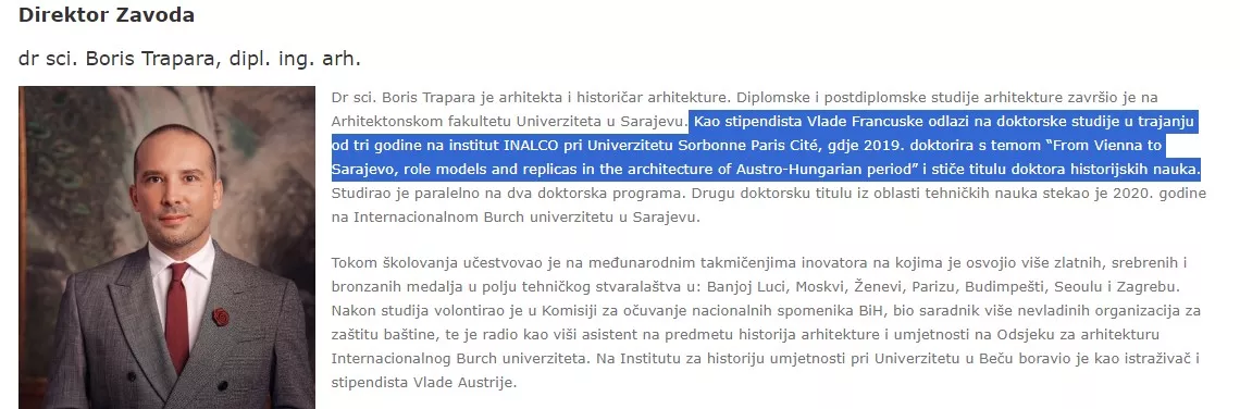 Vlada KS na čelu sa premijerom Edinom Forto 5. avgusta 2021. godine dala je saglasnost v.d. Upravnom odboru Javne ustanove „Kantonalni zavod za zaštitu kulturno-historijskog i prirodnog naslijeđa Sarajevo“ za imenovanje Borisa Trapare za direktora.
