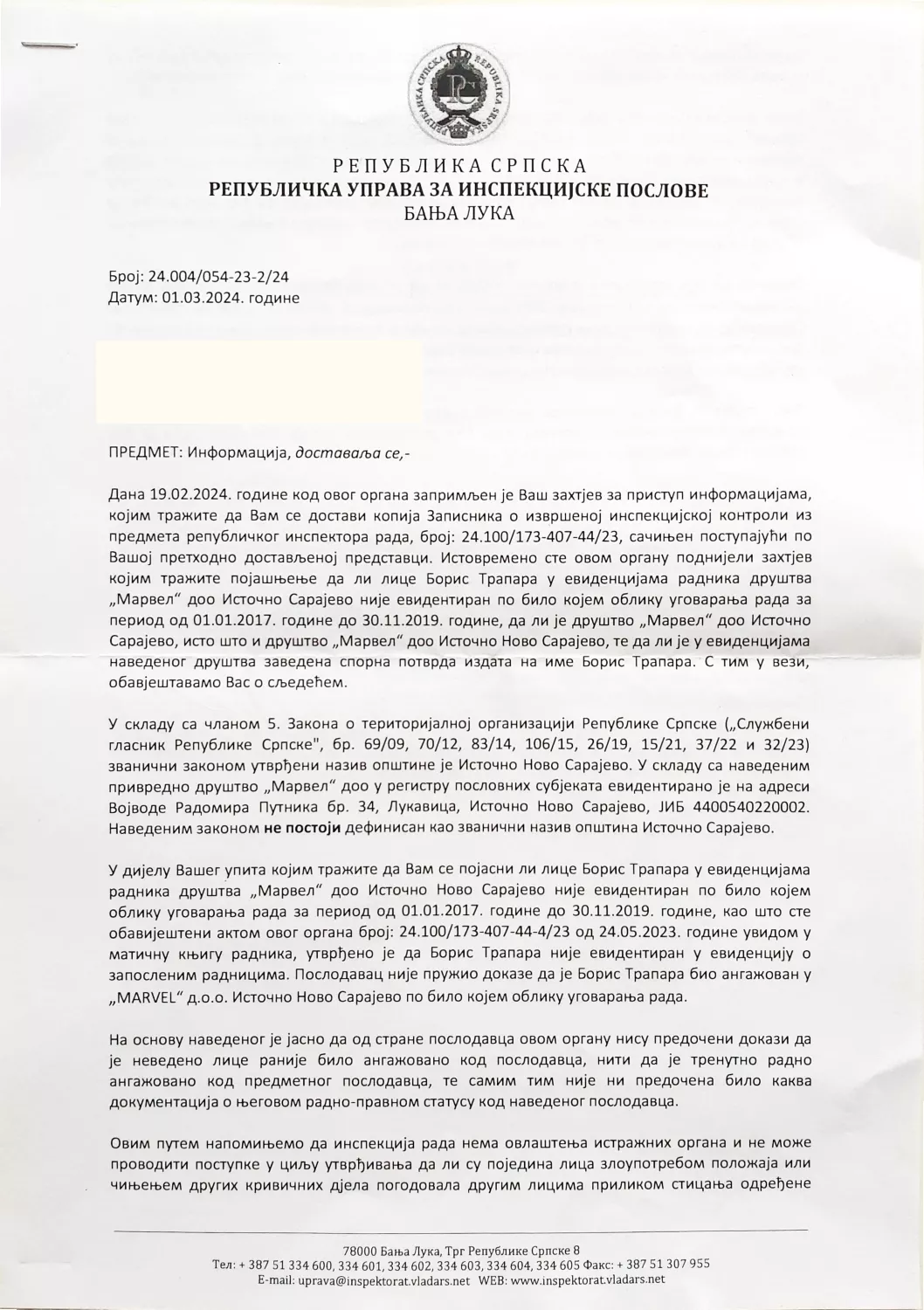 „Poslodavac nije pružio dokaze da je Boris Trapara bio angažovan u „Marvel“ d.o.o. Istočno Novo Sarajevo po bilo kojem obliku ugovaranja rada. Na osnovu navedenog je jasno da od strane poslodavca ovom organu nisu predočeni dokazi da je navedeno lice ranije bilo angažovano kod poslodavca, niti da je trenutno radno angažovano kod predmetnog poslodavca, te samim time nije ni predočena bilo kakva doklumentacija o njegovom radno-pravnom statusu kod navedenog poslodavca“, navodi se u dopisu Republičke uprave za inspekcijske poslove Banja Luka.