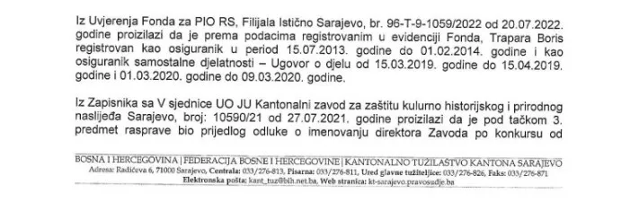 Dodatna dokumentacija iz Fonda za PIO RS, Filijala Istočno Sarajevo od 20.07.2022. godine, pokazuje da je Boris Trapara registrovan kao osiguranik u periodu 15.07.2013. godine do 01.02.2014. godine i kao samostalni osiguranik samostalne djelatnosti - Ugovor o djelu od 15.03.2019. godine do 15.04.2019. godine i 01.03.2020. godine do 09.03.2020. godine. Iako je tačno da u konkursu nije tražen radni staž već radno iskustvo, ovi podaci otvaraju pitanje njegovog angažmana u Marvelu. I da je bio angažiran na ugovor o djelu, kako Trapara tvrdi nekim svojim prijateljima, firma Marvel je bila dužna uplaćivati pripadajuće poreze i u Zavod PIO. No, utvrđeno je da o tome nema tragova.