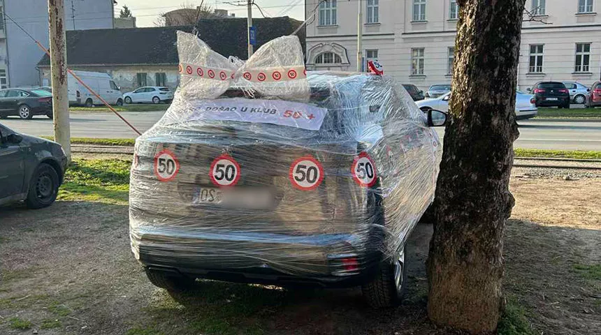 Naime, njemu je netko upakirao vozilo u prozirnu foliju uz prigodnu poruku: "Dobro došao u klub 50+".