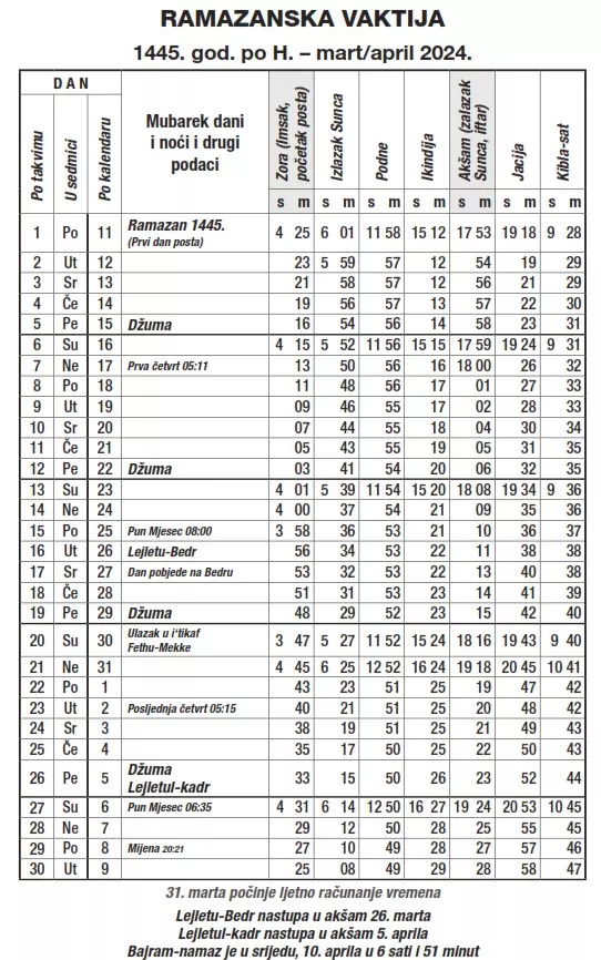 (Patria) - Prema takvimu Rijaseta Islamske zajednice u BiH, zalaskom sunca večeras nastupa mjesec ramazan. Večeras će biti klanjana prva teravija, dok je sutra prvi dan posta. Bajram-namaz je u srijedu, 10. aprila.