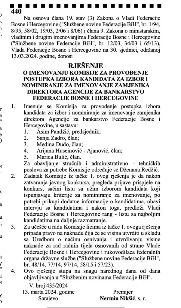 “Imenuje se Komisija za provođenje postupka izbora kandidata za izbor i nominiranje za imenovanje zamjenika direktora Agencije za bankarstvo Federacije Bosne i Hercegovine, u sastavu: Asim Pandžić, predsjednik; Sanja Zadro, član; Medina Dudo, član; Arijana Huseinović – Ajanović, član; Marica Bulić, član. Za obavljanje stručnih i administrativno – tehničkih poslova za potrebe Komisije određuje se Dženana Redžić. Zadatak Komisije je da nakon zatvaranja javnog konkursa, pregleda prijave prispjele na konkurs, sačini listu sa užim izborom kandidata koji ispunjavaju kriterije za nominiranje za imenovanje, po potrebi prikupi dodatne informacije o kandidatima, obavi intervju sa kandidatima i nakon toga, predloži Vladi Federacije Bosne i Hercegovine rang – listu sa najboljim kandidatima na daljnje razmatranje”, navedeno je u Rješenju Vlade FBiH od 13. marta.