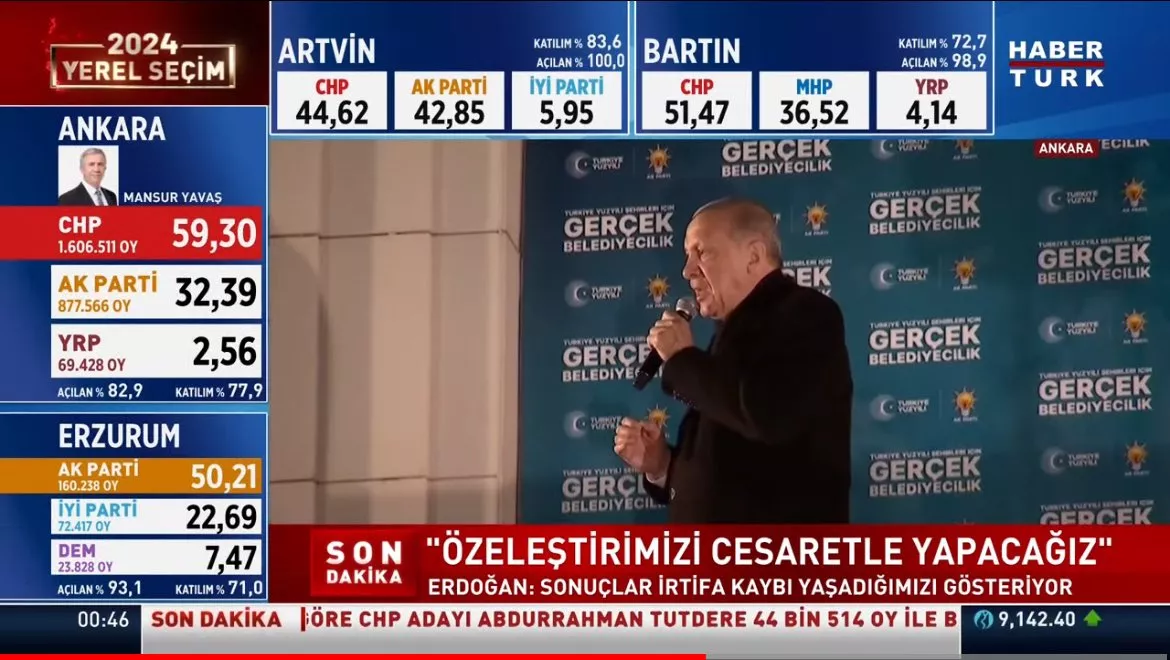 (Patria) - Turski predsjednik Recep Tayyip Erdogan obratio se nakon rezultat izbora u kojem je AKP izgubila sve veće gradove, a CHP pobijedio. Osim Istanbula i Ankare, CHP je pobijedio u Izmiru, Bursi, Adani.