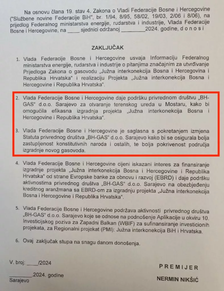“Vlada FBiH daje podršku privrednom društvu BH Gas d.o.o. Sarajevo za otvaranje terenskog ureda u Mostaru kako bi se omogućila efikasna izgradnja projekta Južna interkonekcija. Vlada FBiH je saglasna s pokretanjem izmjena Statuta privrednog društva BH Gas kako bi se osigurala bolja zastupljenost konstitutivnih naroda i ostalih, te bolja pokrivenost područja izgradnje novog gasovoda”, navedeno je u prijedlogu Zaključaka koje je Vladi dostavio federalni ministar energije, rudarstva i industrije Vedran Lakić (SDP).