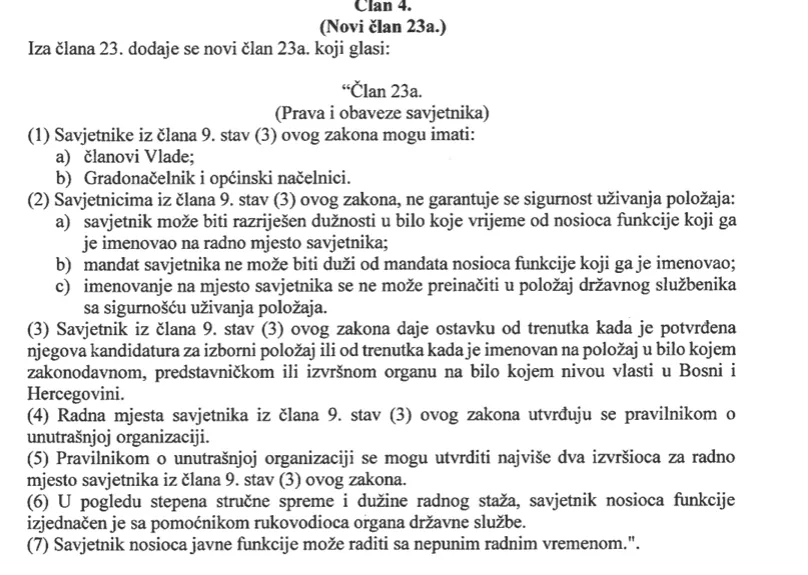 Kantonalni, gradski i općinski organi tada su imali sedam mjeseci da Zakon sprovedu u djelo. Međutim, mnogi načelnici to nisu poštovali, a i danas se vode sudski procesi zbog angažovanja savjetnika na koje su utrošeni milioni maraka, ali i malverzacija sa prelaskom savjetnika preko noći iz jedne u drugu instituciju.