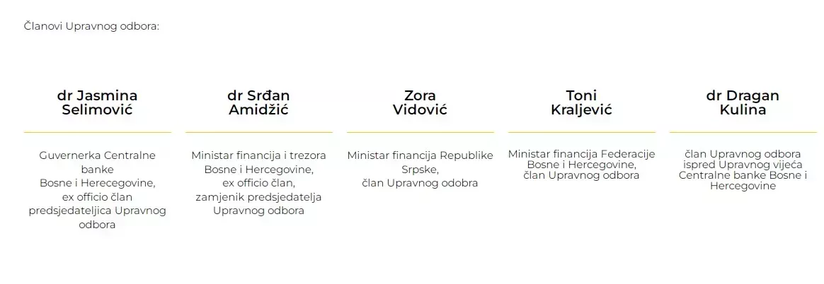 Inače, guverner Centralne banke Bosne i Hercegovine i ministar finansija i trezora Bosne i Hercegovine, ili osobe koje oni ovlaste, su ex officio članovi Upravnog odbora.