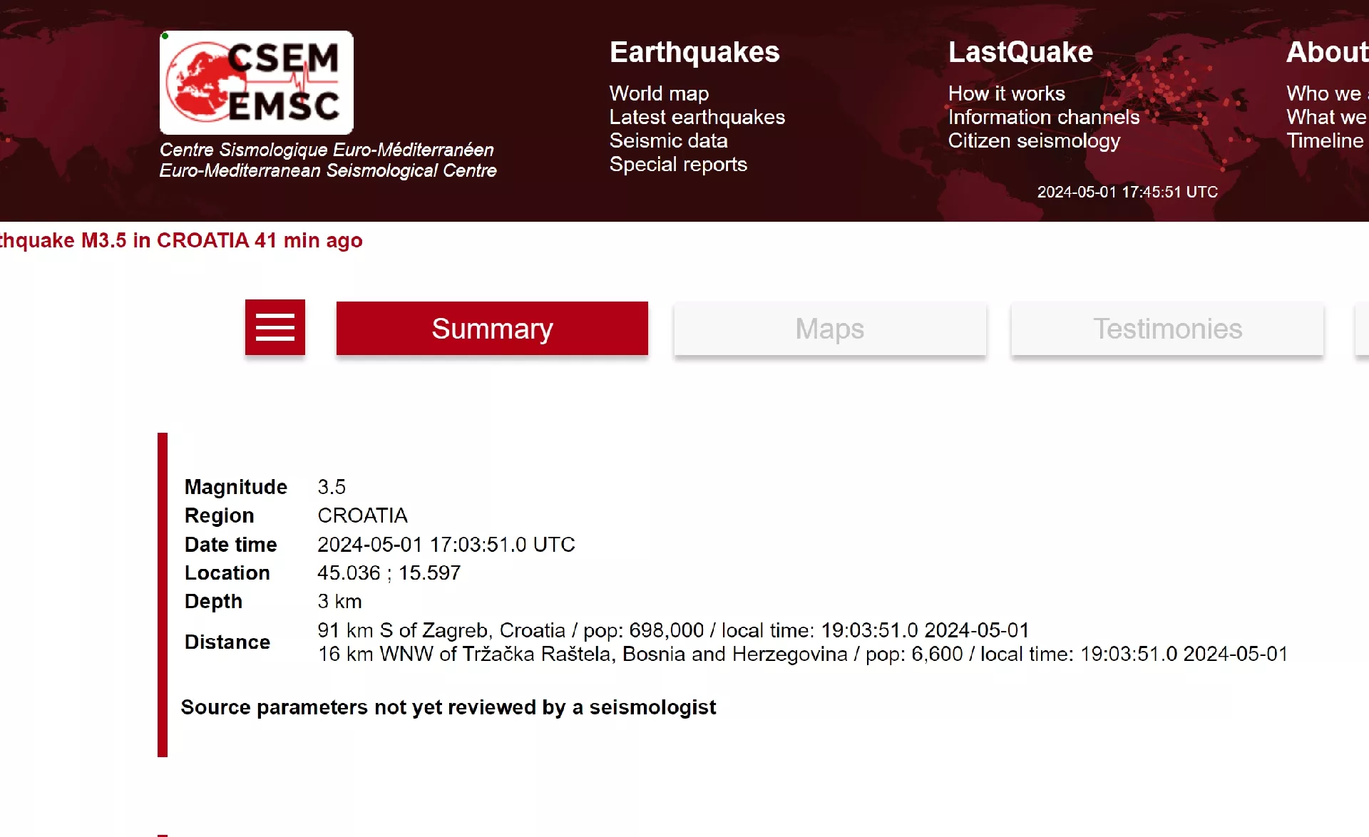 ⚠ Automatic crowdsourced detection, not seismically verified yet. More info soon! pic.twitter.com/aQyWQvBUmV— EMSC (@LastQuake) May 1, 2024