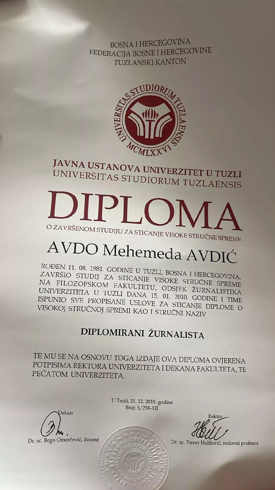 I pitali smo. Ne, samo Avdića, već i njegovog mentora Najila Kurtića, umirovljenog profesora Univerziteta u Tuzli, inače jednog od najcitiranijih komunikologa u Bosni i Hercegovinu. Avdić nam je svoju diplomu dostavio na uvid i objavu, dok je profesor Kurtić podcrtao da je diploma Avdića čista kao sunce.
