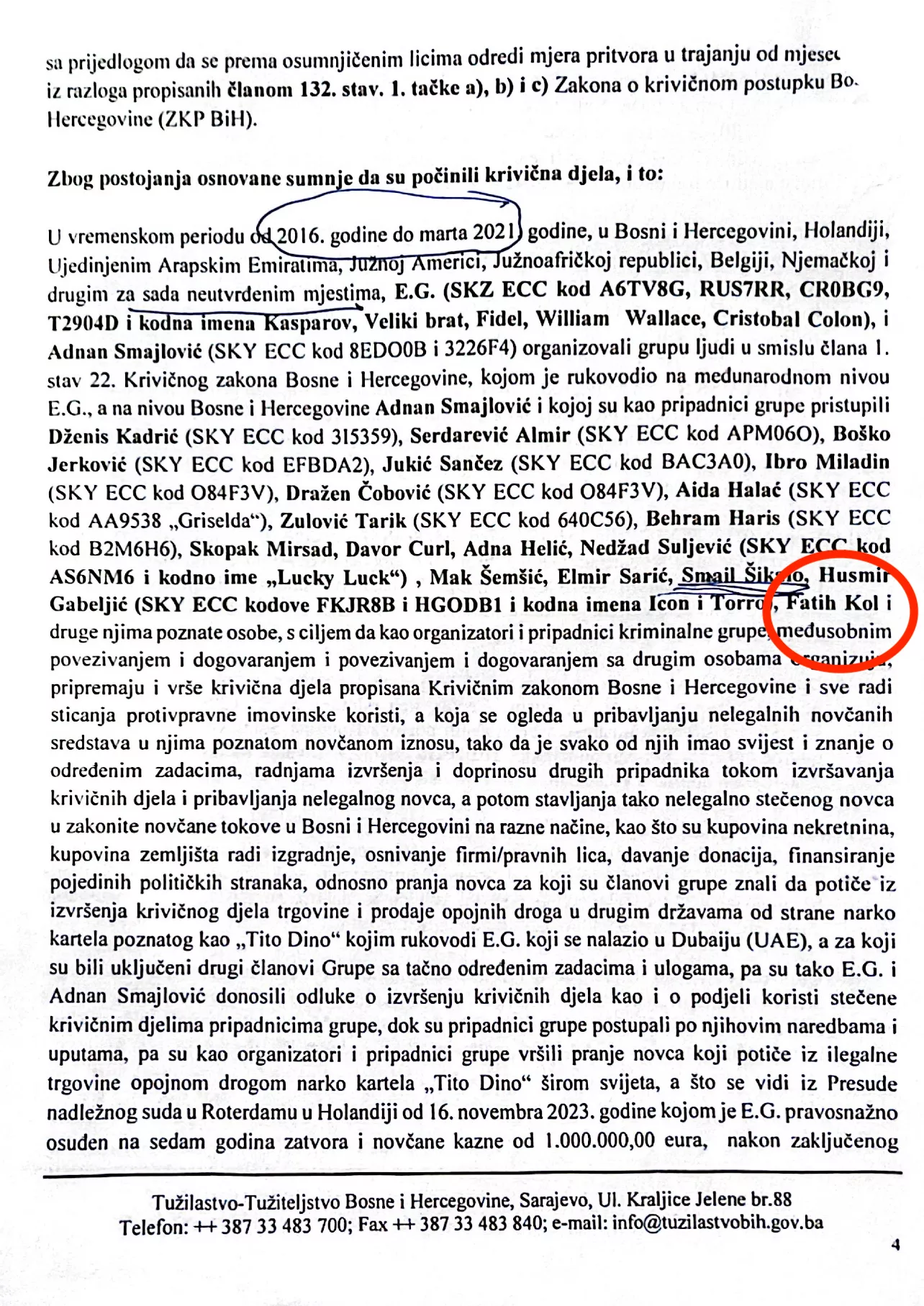 Ovo je dokument Tužilaštva BiH, odnosno prijedlog za određivanje mjera pritvora. Na spisku osoba osumnjičenih za organizirani kriminal i pranje novca nalazi se počasni bh. konzul u Panami Fatih Kol.