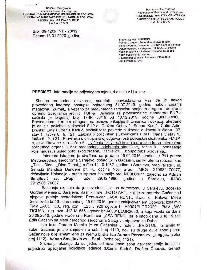 “Dokazima je potkrepljeno postojanje osnovane sumnje da je Gordan Memija učestvovao u organizaciji nabavke i doniranja specijalnih policijskih uniformi Specijalnoj policijskoj jedinici Federalne uprave policije FMUP-a u periodu 2016/2017 godine, na način da je sredinom 2016. iznos od oko 320.000,00 Eura, preuzet od Elmira Sarića i njegove supruge Nathalie za koji je znao da potiče iz kriminalnih aktivnosti, po uputama E.G, te dogovorio sa svojim poznanikom i bliskim poslovnim partnerom Alamerović Erminom zvanim „Kiki“ da njemu preda novac za realizaciju donacije specijalne opreme Federalnoj upravi policije, kako bi Alamerović posredstvom svoje firme “Rhea Expres” izvršio nabavku i uvoz specijalne policijske opreme koju će potom uručiti kao donaciju, a sve kako bi se prikrio trag novca, odnosno izvršilo “pranje” novca koji potiče iz krivičnih djela neovlaštene trgovine opojnim drogama od strane organizovane kriminalne grupe “Tito i Dino”, navedeno je u Rješenju Suda Bosne i Hercegovine kojim se određuju mjere zabrane Gordanu Memiji.
