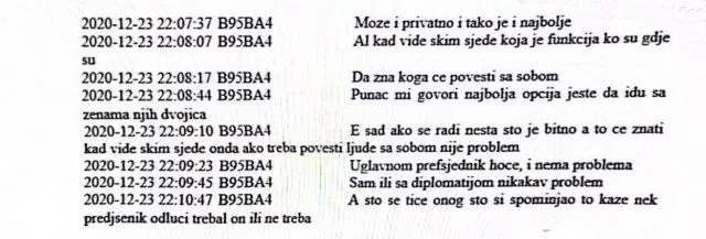 “Može i privatno, tako je najbolje. Ali kad vide s kim sjede, koja je funkcija, ko su, gdje su. Da zna koga će povesti sa sobom. Punac mi govori, najbolja opcija je da idu sa ženama njih dvojica. E, sad, da se radi nešto što je bitno, a to će znati kada vide s kim sjede, onda ako treba povesti ljude sa sobom to nije problem. Uglavnom, predsjednik hoće, i nema problema. Sam ili sa diplomatijom, nikakav problem. A što se tiče ono što si spominjao, nek predsjednik odluči treba li on ili ne treba”, pisalo je u porukama pronađenim u Sky telefonu Dženisa Kadrića.
