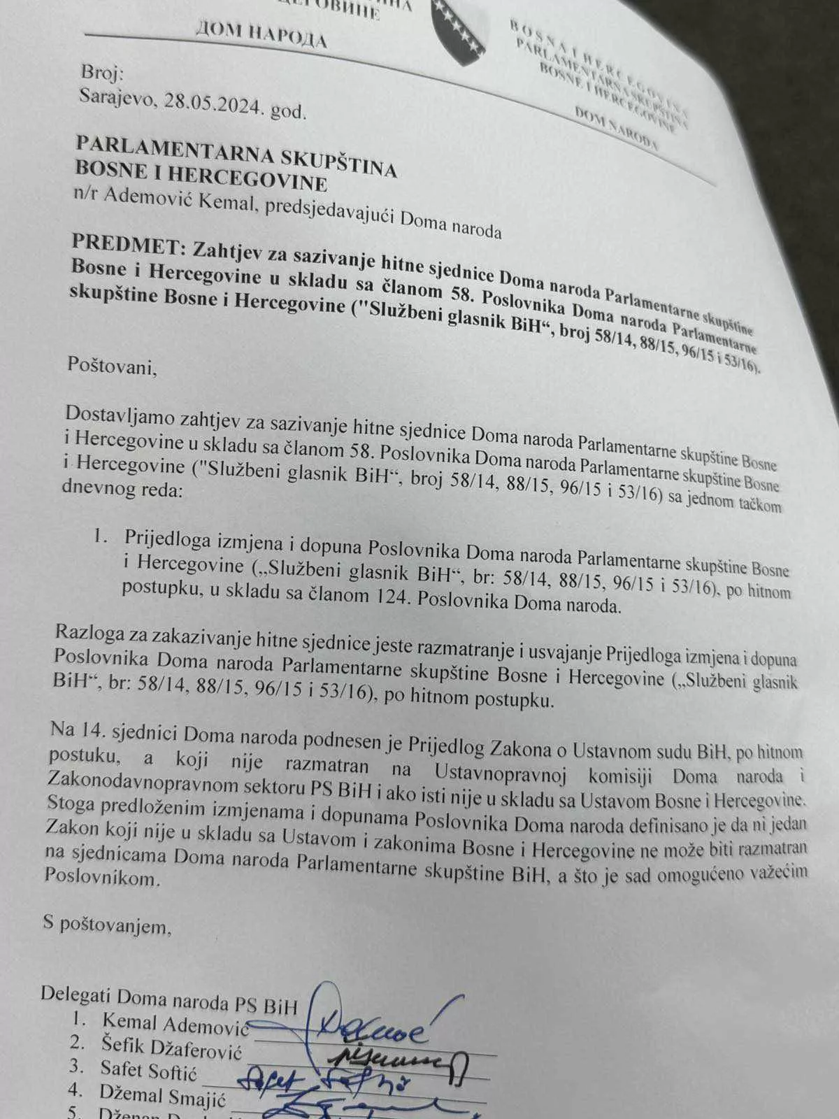„Klub bošnjačkog naroda u Domu naroda Parlamentarne skupštine Bosne i Hercegovine podnio je zahtjev za održavanje hitne sjednice Doma naroda sa jednom tačkom dnevnog reda, izmjenama i dopunama Poslovnika Doma naroda, koje imaju za cilj da se onemogući predlaganje neustavnih zakona.“