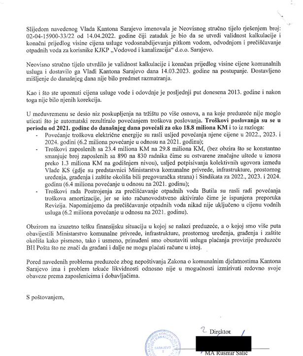 Također u odgovoru Čičiću, iako ga ništa nije pitao, Salić pojašnjava da voda mora poskupjeti te da se Vlada KS od marta 2023. godine nije odredila o Prijedlogu cijene usluga vodosnabdijevanja. Salić također navodi da je cijena vode ostala ista od 2013. godine, dok su svi drugi troškovi rasli zbog čega su se povećali i troškovi Vodovoda i kanalizacije.