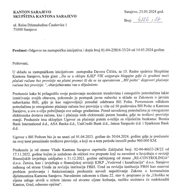 (Patria) - Kantonalni zastupnik SDP BiH Davor Čičić uputio je inicijativu preduzeću KJKP Vodovod i kanalizacija da osiguraju blagajne gdje će građani moći plaćati račune bez provizije ili da se postigne dogovor sa BH Poštom kako bi se računi plaćati na šalterima bez provizije.