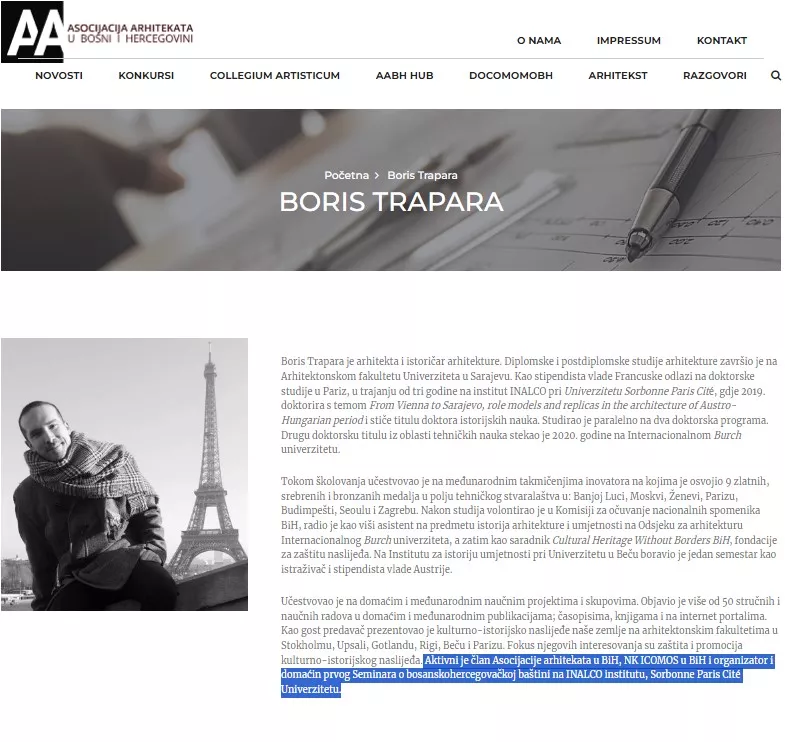 S druge strane, u biografiji koja je objavljena na stranici Asocijacije arhitekata u BiH za Traparu se navodi da je „član Asocijacije arhitekata u BiH, NK ICOMOS u BiH“.