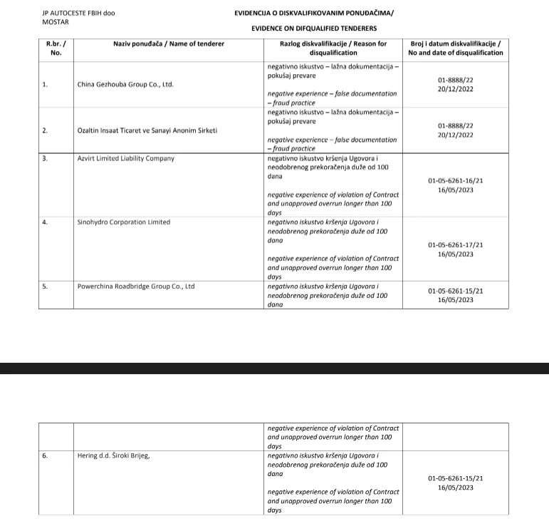 (Patria) - Prethodna Uprava JP Autoceste FBiH u periodu od 2021. do 2023. godine uspostavila je tzv. „crnu listu“ kao preventivnu mjeru protiv korupcije i nepravilnosti u javnim nabavkama, u skladu sa Zakonom o autocesti na Koridoru Vc.