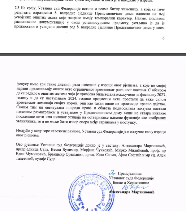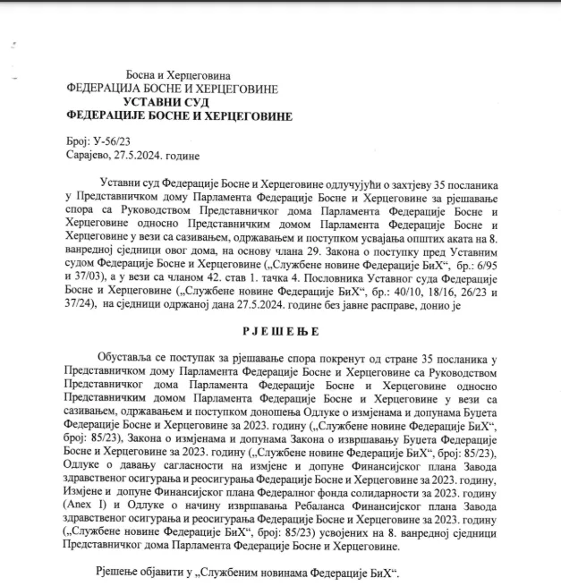 No, ćirilica nije jedini problem u cijeloj priči. Ustavni sud Federacije ocijenio je da s obzirom na to da je fokus sjednice bio budžet, odnosno finansijski okvir Federacije za 2023. godinu u 2024. prestaju posljedice.