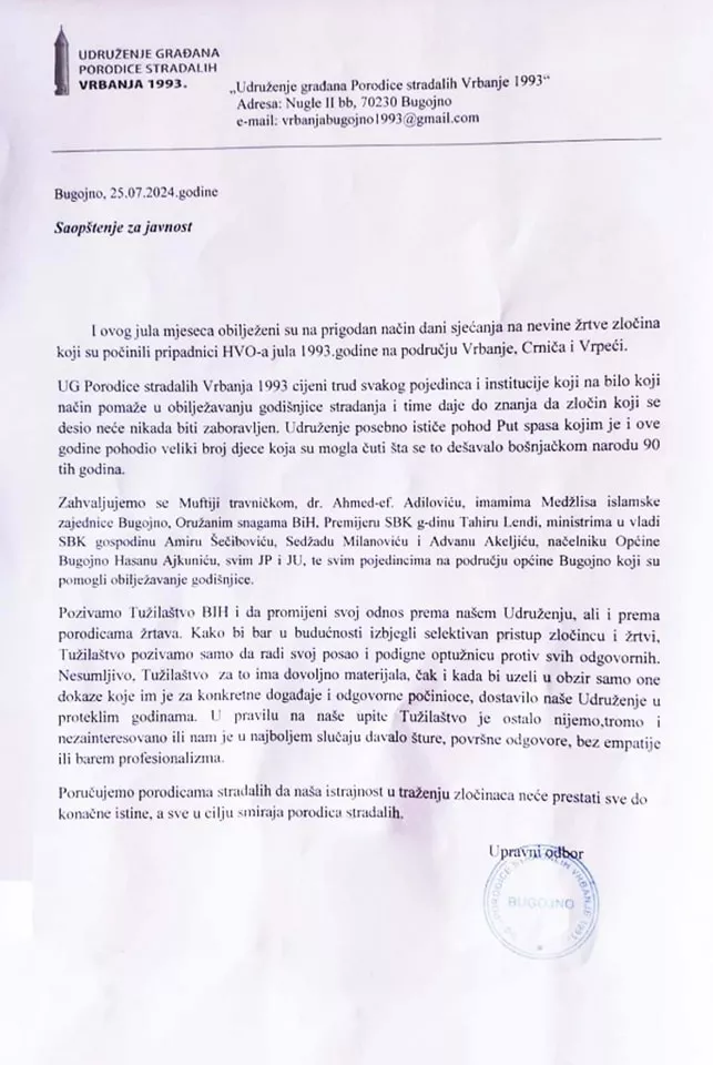 Selektivni pristup koji Udruženje građana Porodice stradalih Vrbanje 1993. spominje potvrdilo je i jučerašnje izvještavanje BHRT-a. Dolasku hrvatskog ministra vanjskih poslova Gordana Grlića Radmana i predsjednika HDZ-a BiH Dragana Čovića da odaju počast hrvatskim žrtvama u Bugojnu dat je veliki publicitet, a žrtve Vrbanje su potpuno ignorisane.