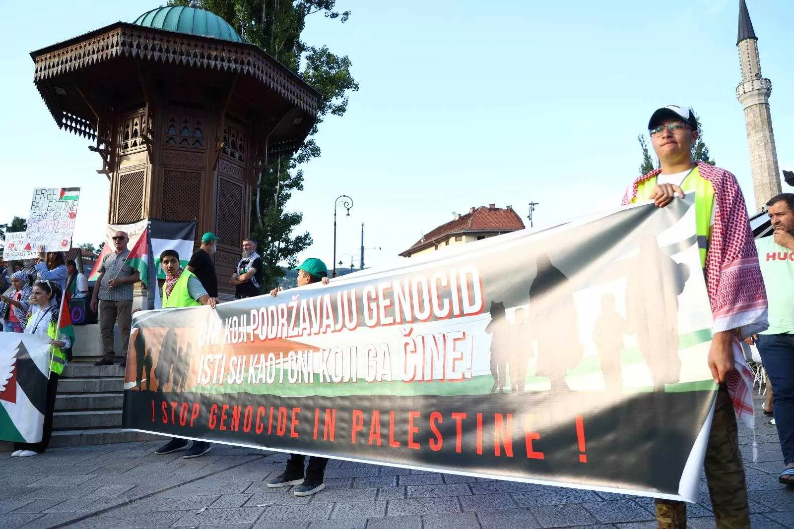 "BiH je uz Palestinu", Izrael nije država, već teroristička država", "Oni koji podržavaju genocid, isti su kao i oni koji ga čine", bile su neke od parola istaknutih na transparentima.